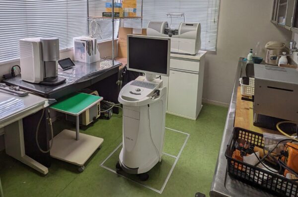 当院のCAD/CAM技工室です。手前にあるものが被せ物の設計をするコンピュータ、奥にあるものがミリングマシーンといって被せ物を削り出す機械です。